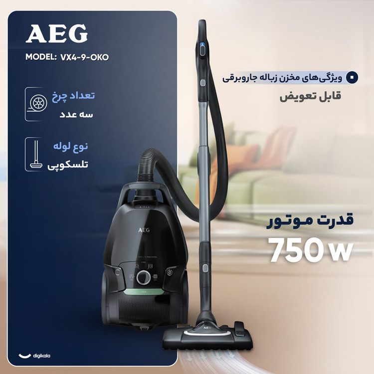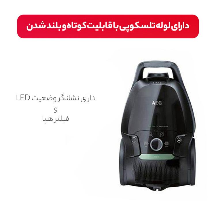 سایر توضیحات : بدنه پلاستیک با دوام و نشکن / لوله فلزی تلسکوپی / محل قرارگیری سریهای کوچک روی دستگاه / قرار گرفتن به صورت عمودی و افقی / شلنگ پلاستیکی منعطف و بادوام / نشانگر LED میزان مکش / نشانگر کثیفی فیلتر / دسته ارگونومیک / لوله آلمینیومی بسیار سبک