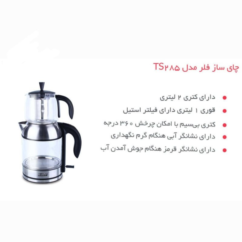 چایساز «فلر»، مدل «TS 285»، یکی از زیباترین مدل چایسازهای این شرکت است. این چایساز شامل یک کتری و یک قوری است که هرکدام زیبایی و کیفیت مناسبی دارند. حجم کتری 2 لیتر است و روی پایهی اصلی قرار میگیرد. با این طراحی، کتری بدون سیم و قابل جابهجایی بوده و چرخش روی پایه، بدون محدودیت است. بدنهی کتری ترکیبی از پلاستیک و قطعات استیل و شیشهی مقاوم به حرارت است. المنتهای حرارتی در کف کتری آب را بهسرعت به جوش میآورند. در این مدل قوری روی کتری قرار میگیرد. قوری مدل TS